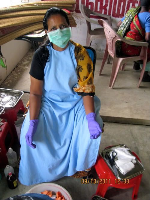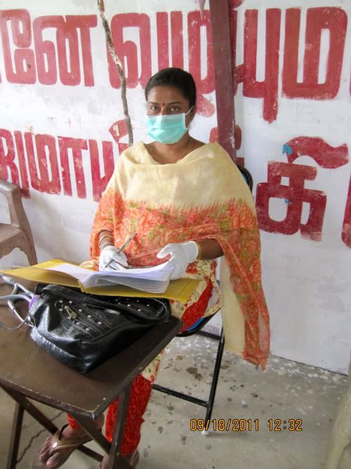 Dr. Souguna. So doctor's in India are a whole topic of their own. They don't have to do like pre-requisites in school in order to get into doctorate programs, so they just go right into them, and basically they don't have much schooling. YET, they are treated with so much respect. For instance, she doesn't help with anything. She sits in the van and waits for us to set up and then immediately when she is finished with her work, she goes back to the van and waits for us to clean up. Kind of funny.