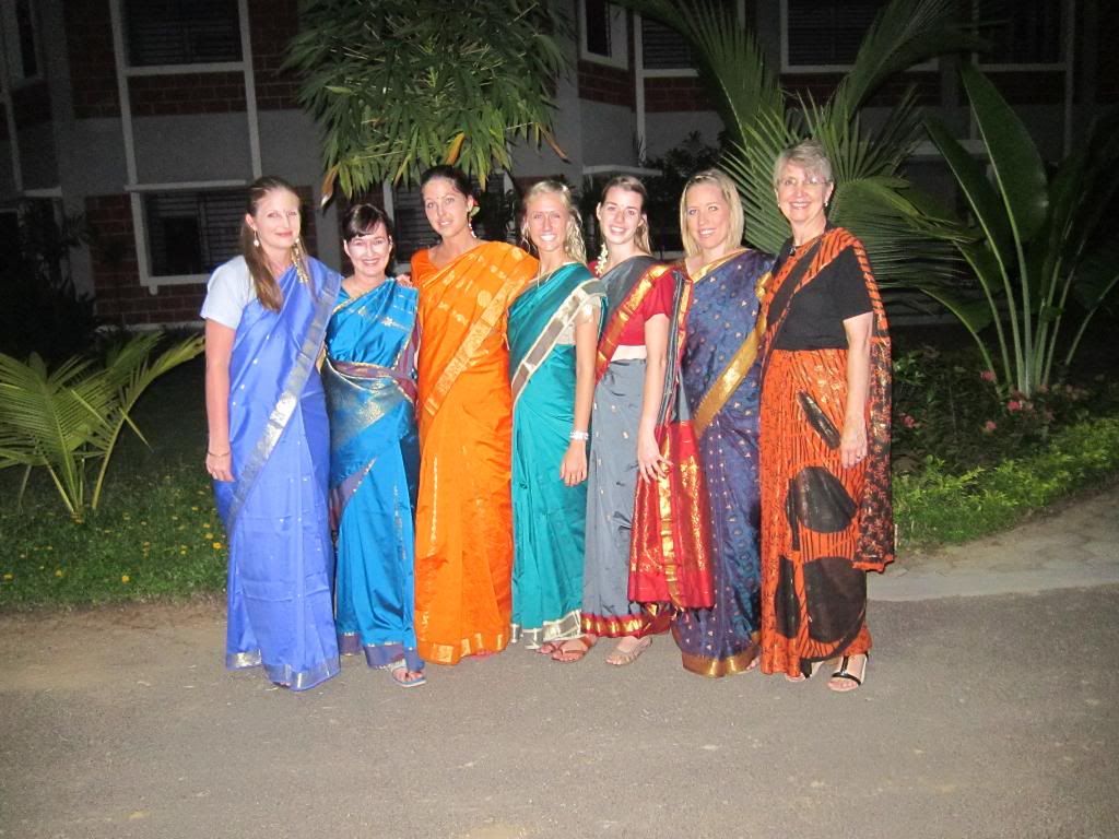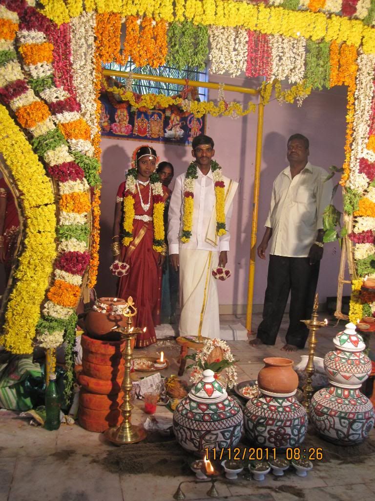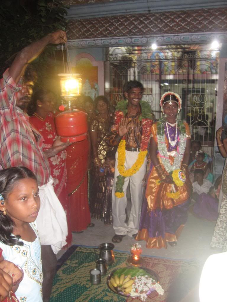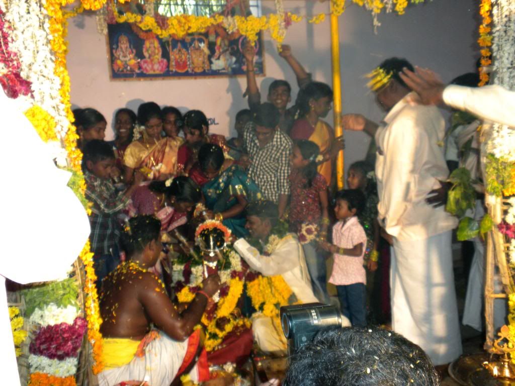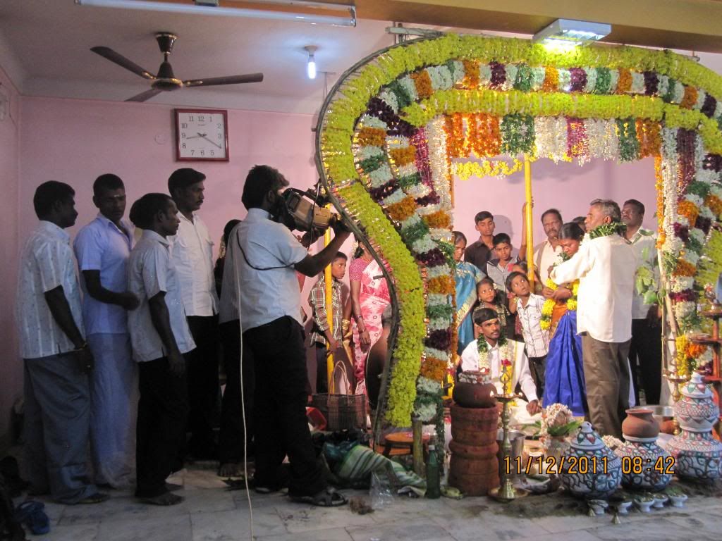 I can now check off the "Go to a Hindu Wedding" on the list of "must do's while you are in India" list. Anbu, one of the handy-men, got married on Sunday morning to a beautiful, young terrified bride. Hindu weddings are celebrated on two different days. So, on Saturday night, all of the volunteers, decked out in Sari's and gold jewelry, packed into the van with the kids to go to the reception celebration. Venilla Mary let me borrow one of her many saris and put a beautiful necklace around my neck with a matching bracelet. We all wore flowers in our hair and put on make up (the first time in a long time, folks).