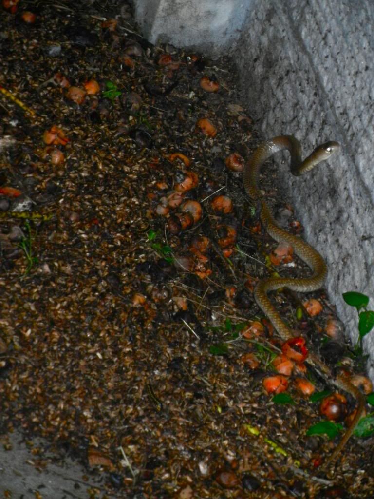 So today, I finished up one of my classes and ran home to grab a snack and fill up my water bottle. This may be too personal, but the first thing I did was go to the bathroom. I shut the garbage can and out of nowhere, a snake slithered through my feet and into the corner of the shower area. I jumped up onto the seat and screamed. When it stopped moving, I escaped out the door and onto my bed. Everything happening so fast, the snake slithered out the bathroom door, around the corner of my bedroom door, and into the foyer of the Green House. I sneaked my way out the door, checking to make sure that I wouldn't step on it, and ran to get my phone to call Papa Gates to come and save me.