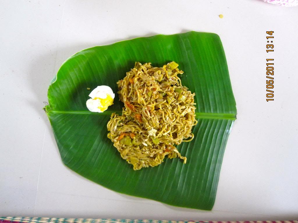 Then she made us a dish that I will for sure adapt in the States. She took okra, tomatoes, and potatoes and fried it up with sunflower oil. When they were softened and cooked through, she added in Maggie Moos (Top Ramen) and cooked the noodles through. Then, she added two eggs, and waited till they were scrambled. She finished by putting in the packaged seasoning, adding some Indian pepper and serving it to us on a banana leaf with a boiled egg. I will never eat regular ramen again.