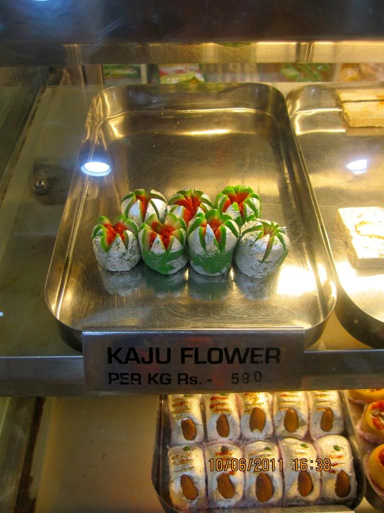 And the last one I want to talk about is Kaju Flower. This is an Indian dessert that is especially cool because it is cooked with Silver on top. Desserts here are generally not very good- all sugar, no flavor. It tastes like eating a sugar cube. So, I don't particularly like eating them, but they are amazing because of their designs. They are all shaped into crazy things, look like flowers, or have beautiful designs on them. One of my favorite processes is the Silver adding, because you can totally taste and feel the texture of the silver.