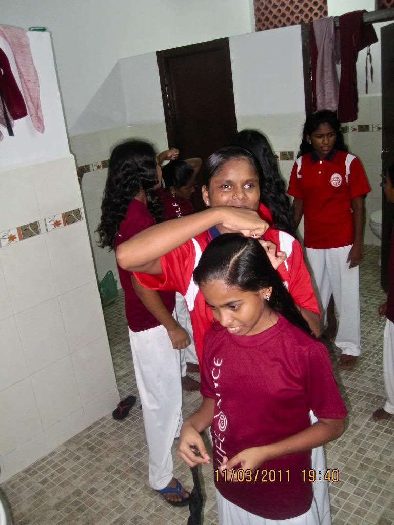 Before the performance, all the girls were in the bathroom, crowded around the mirrors, slicking their hair back and putting on lipstick. It just proves to show that girls everywhere are alike. I walked in, and all of a sudden, it was like being back home with American girls getting ready for a competition. Girls with no pants, girls laughing and singing, girls doing each others hair. We even took "mirror" pictures. I am so grateful to have had the opportunity to be with my girls for that half hour.